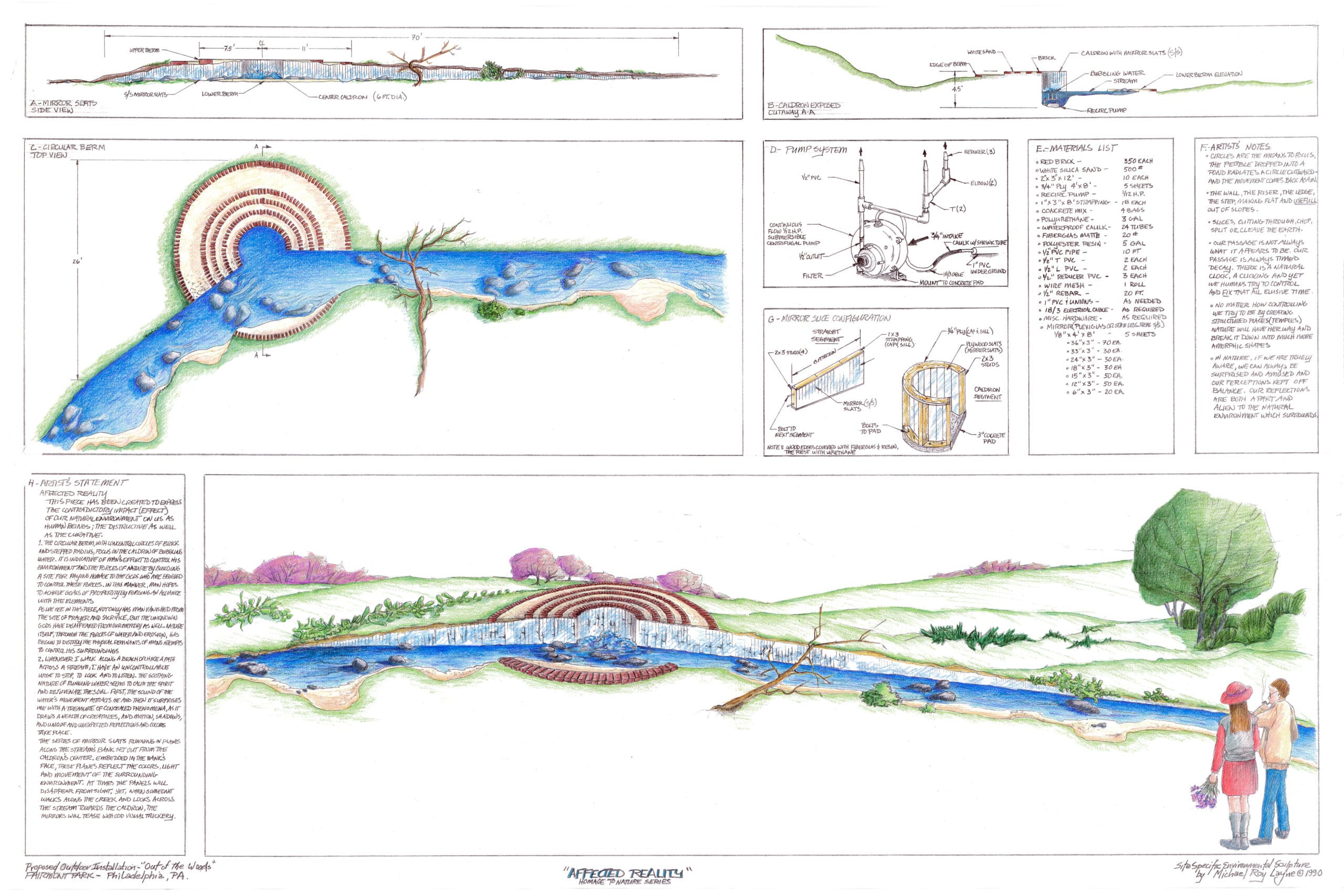 "My sculptural environments are aesthetically pleasing site-specific artworks that connect nature and culture by employing the three legacies for regenerative and sustainable design of (1) environment: natural systems, (2) education: experiential systems, and (3) engagement: cultural systems. By using a variety of art media and fabrication methods to create sculptural open spaces that are intended to support personal rejuvenation and inspiration, my sculptures provide venues for environmental learning and community celebration.”