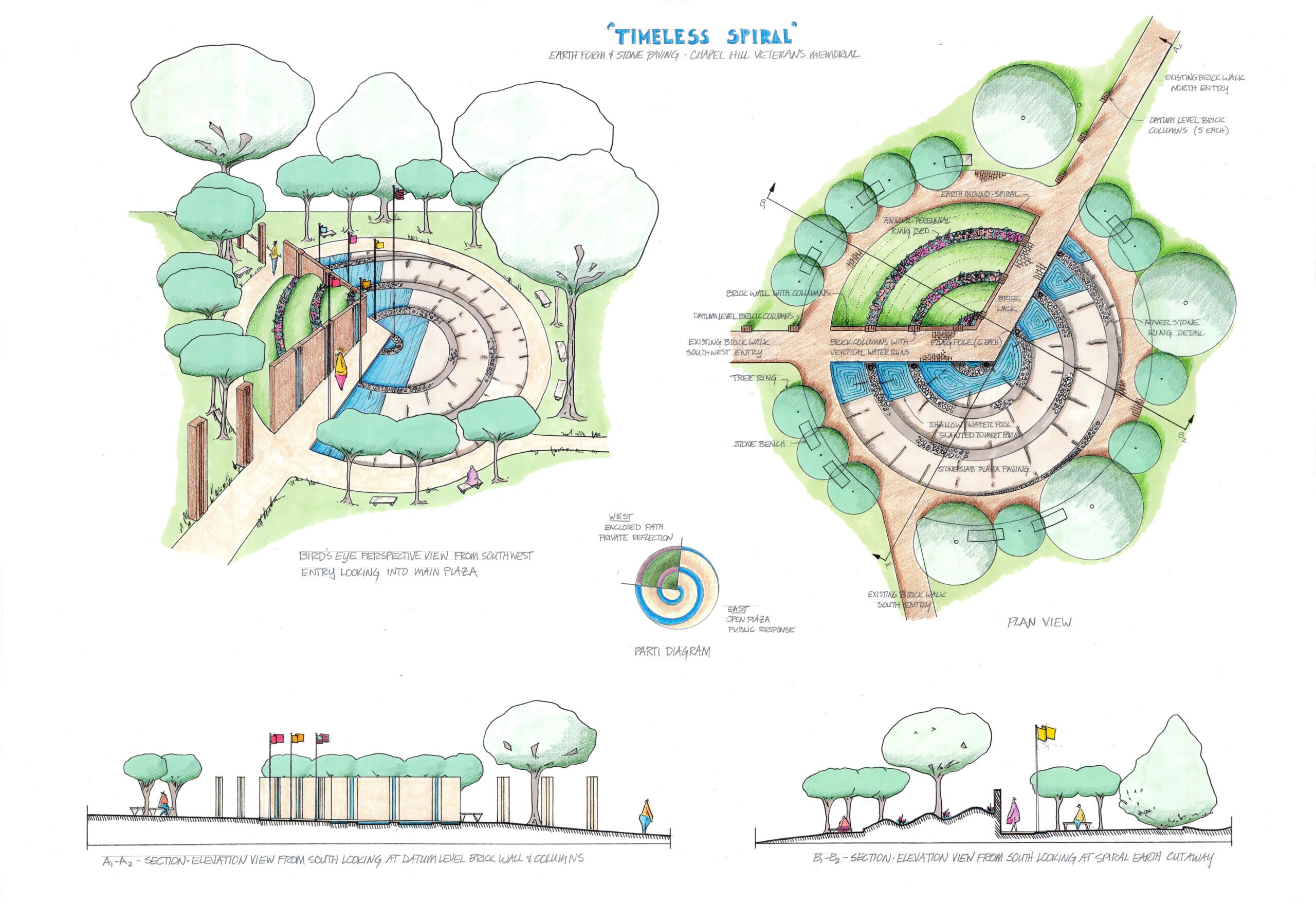 - Media: Sketchup drawings – Materials: Flowering deciduous trees, granite, bronze, steel, grass
