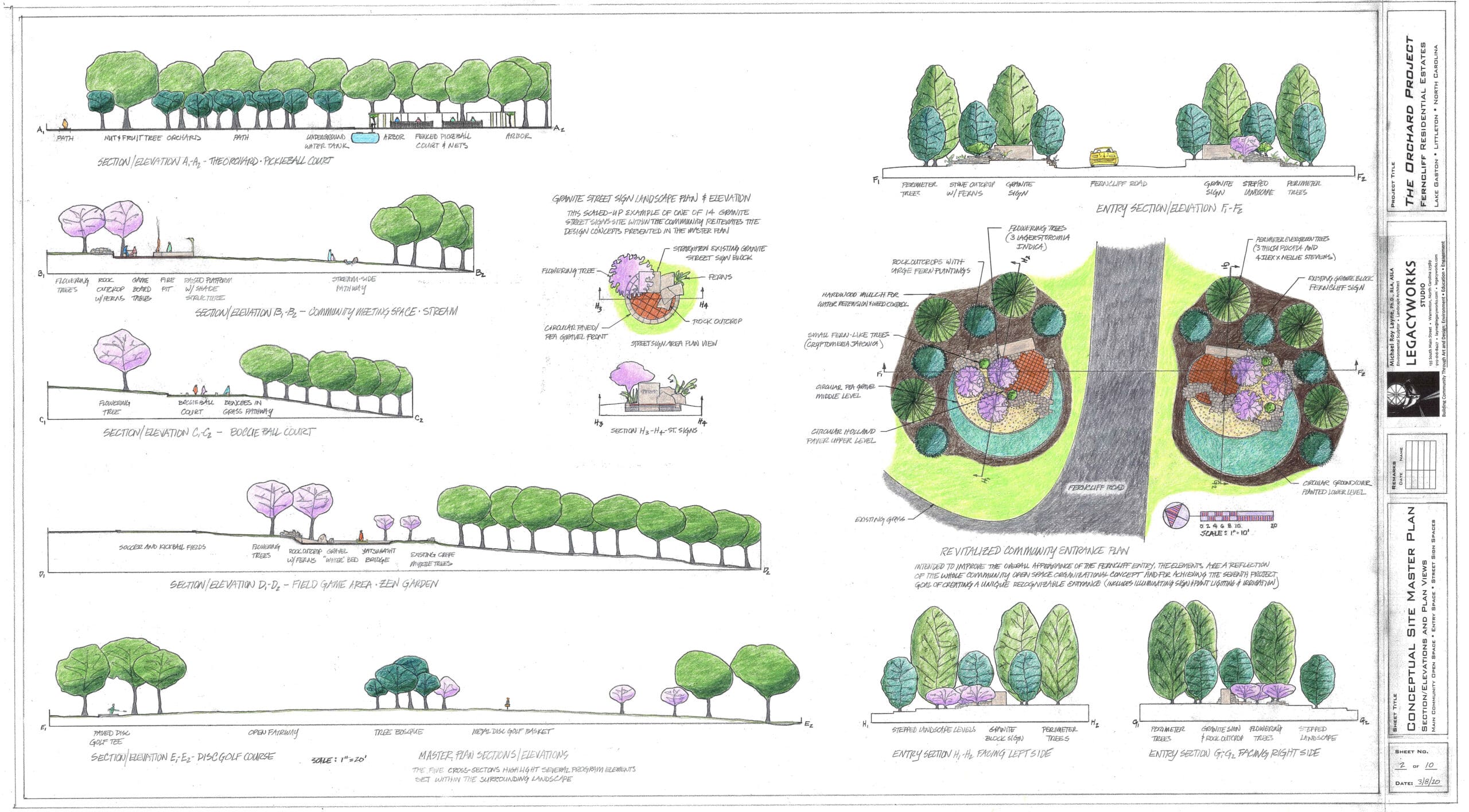 Combining the Fencliff name with the goal of creating a distintive community visual identity, the scheme promotes the idea of an emerging new community growth as expressed by the expansion of the fern. The layout program is based upon the fiddle fern form. The organizing concept is to create a unified system with fern fronds or leaves representing the activity nodes radiating out from the connecting central pathway. The plantings and man-made elements spotlight the locations of the community enhancing elements as viewed from the roadways. The purpose is to highlight these new elements yet have them fit well into the surrounding forested landscape.