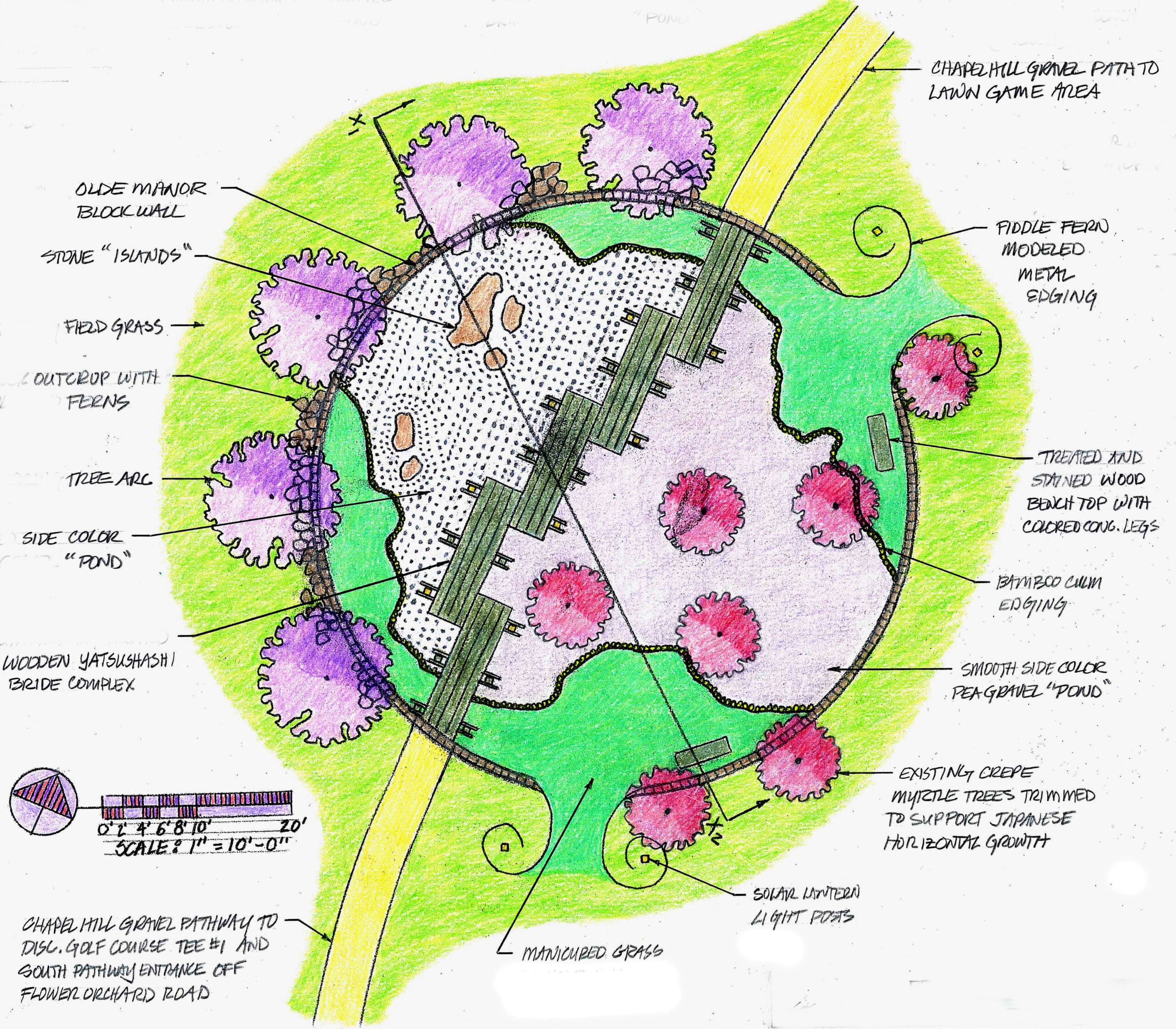 - Zen Garden (rock outcrop and ferns edge the garden circle, gravel “water” beds on both sides