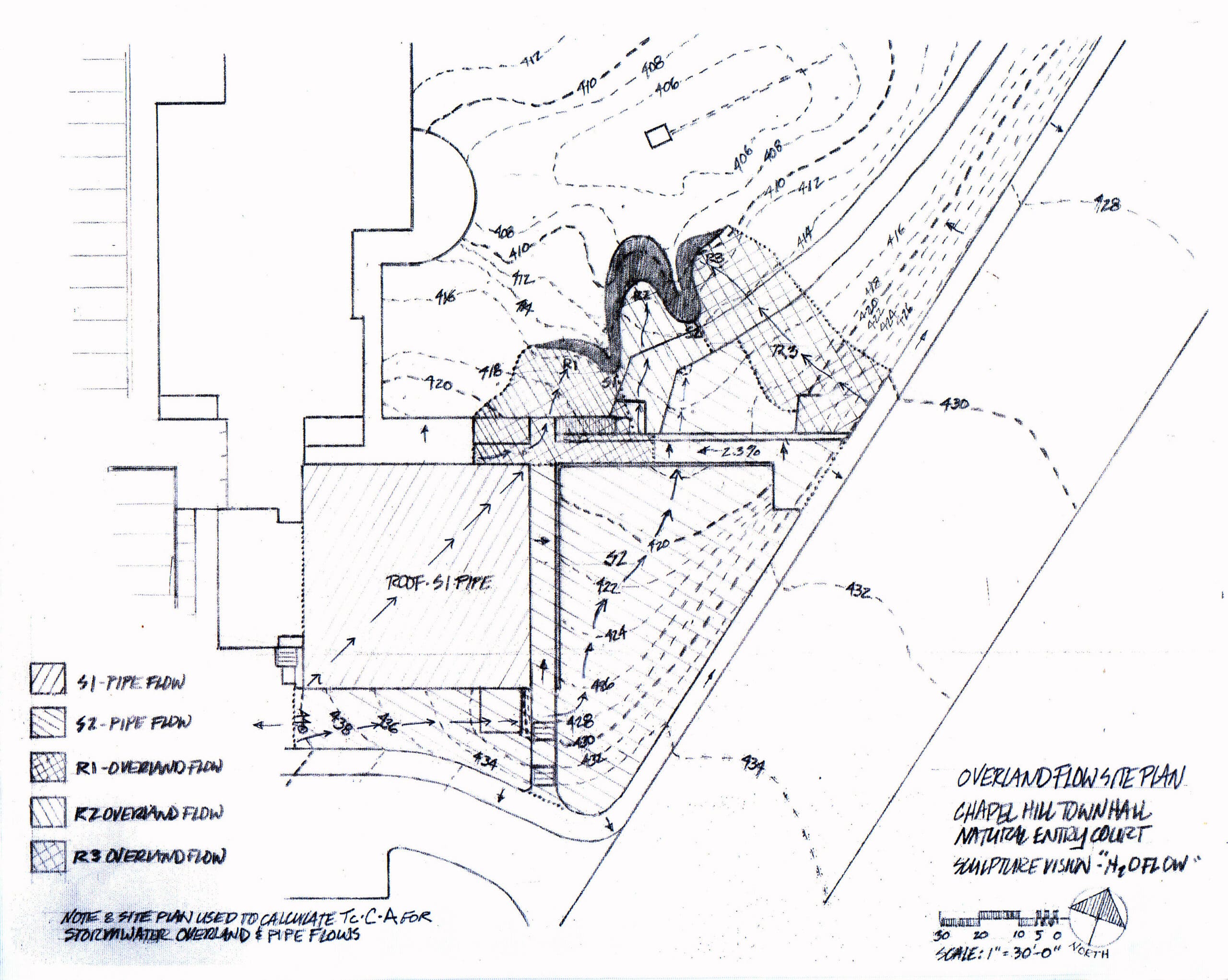 Horticulture students enrolled in a landscape design studio at North Carolina State University assisted with the installation while learning practical applications of grading, drainage and stormwater management survey, analysis and construction techniques. These concepts were later employed to inform one of their in-school landscape design projects. Requiring approval of the Town Arts Advisory Board, this project shows how art can spotlight and even repair natural systems. Layne worked with the Chapel Hill Town Storm Water Management, Landscape Design, Urban Forestry, and Sustainability staff to make sure the concept was viable and to ensure the construction materials and methods met all Town regulations and standards.