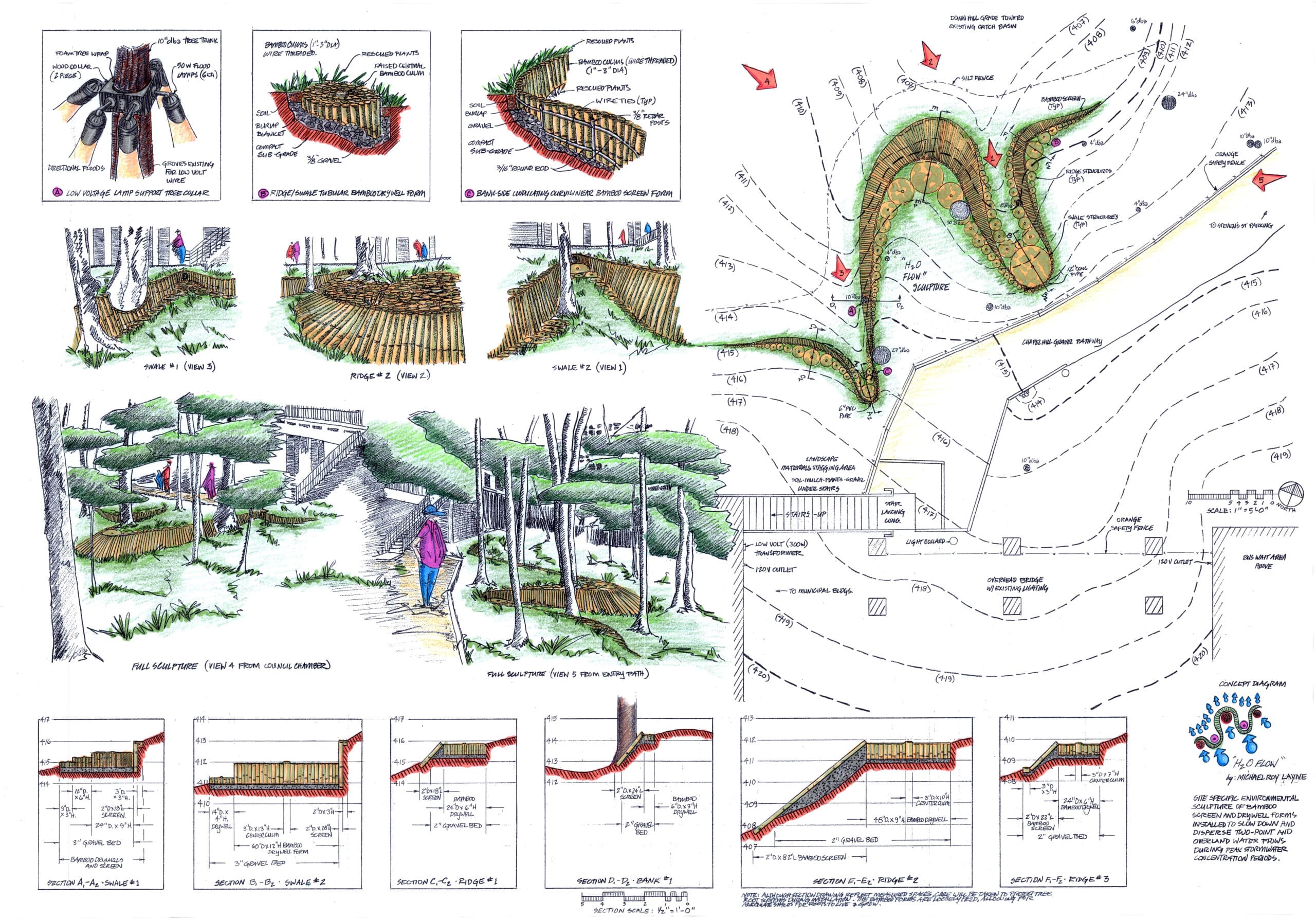 Supporting an increased awareness of the importance of understanding how man’s actions effect the land and how interactions between people can influence the use of natural and cultural resources, Dr. Layne created this sculptural work of art, H2O Flow, in order to promote a greater perception of the relationships that exist between natural, cultural, and experiential systems. Defined as aesthetic engineering, the three main objectives were to: (1) create an aesthetically pleasing site-specific environmental artwork that followed and spotlighted the natural existing topography, depicting the water collecting and water dispersing forms; (2) employ art to solve a man-made ecologically degrading environmental problem by slowing down and dispersing single point and overland water flows during peak stormwater concentrations; and (3) provide opportunities for community participation in creating public works of art and in educating the public to the value of artwork in our lives.