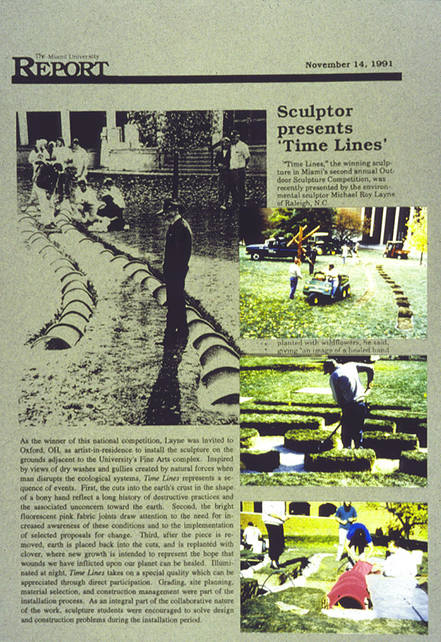 As the winner of the national Miami University of Ohio Outdoor Sculpture Competition in 1991, Layne was invited to be artist-in-residence and to install this piece on the grounds adjacent to the University’s Fine Arts complex. Grading, site planning, material selection and construction management were part of the installation process. As an integral part of the collaborative nature of the artwork, sculpture students were encouraged to solve design and construction problems during the installation process. Directly involved in the fabrication procedure, the sculpture students were also challenged through an interactive dialog regarding both the role of the artist in society and the concepts and inspirations surrounding environmental art. This whole installation was videotaped and archived at the school for future teaching and exhibition purposes.