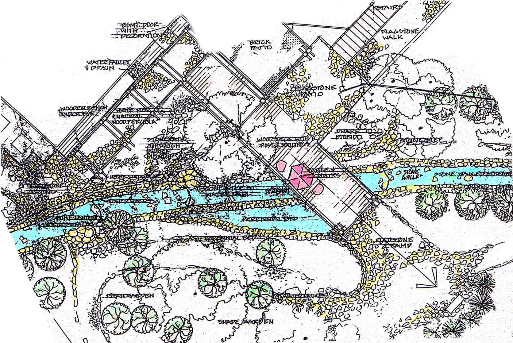 The landscape structure of Timed Flow including walls, arbor, patios, decks, fences, gates and ramps were all designed and installed in a particular pattern corresponding directly to the house plan and its entrances and outdoor viewscapes in order to improve the visual or spiritual continuity of the whole site. The selected materials of wood and stone reflect the client’s need for order while creating an ADA accessible environment. The plantings, flower beds, meandering paths and stream corridor are designed and built in opposition to this grid, providing landscape interest for the contrast between man-made and nature.